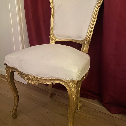 Polstret spisestuestol med hvidt betræk og sølvfarvet træstel. Ryglænet er højt og buet med knapstikninger og dekorative udskæringer i trærammen. Sædet er polstret for øget komfort, og kanten er afsluttet med nitter. Egnet som spisebordsstol eller som enkeltstående stol i f.eks. stue, soveværelse eller entre.