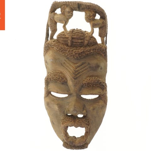 En rå og karakterfuld håndskåret træmaske med varme jordtoner, sort markeret mund og de dér intense rød-sorte øjne, som følger dig rundt i rummet.
