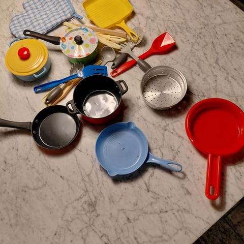 Pakke med trælegetøj til rolleleg og legekøkken.