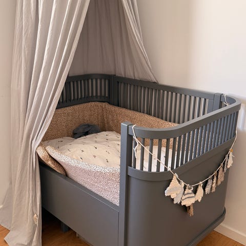 Ældre Sebra tremmeseng i grå. Tremmesengen ses på billederne opsat som juniorseng med siderne afmonteret, og de løse tremmesider medfølger. Sengen er i træ og er egnet til småbørn og mindre børn afhængigt af opsætning. Velegnet som barnets første seng og senere som juniorseng ved at justere siderne.