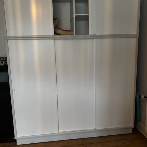 Der er 2 lange bøjlestænger i begge underskabe og hylder i begge overskabe.