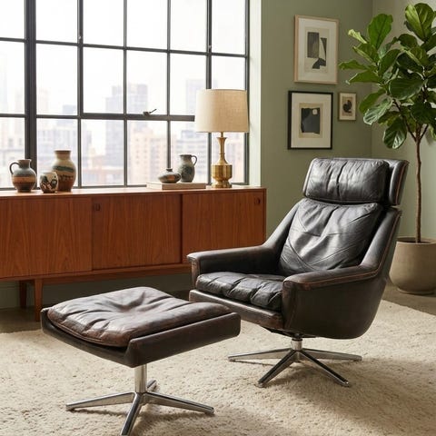 Sælger dette utroligt lækre loungesæt bestående af en drejestol og tilhørende skammel. Her får du den helt rigtige 1970’er-æstetik, der passer perfekt ind i det moderne hjem med hang til retro og kvalitet.