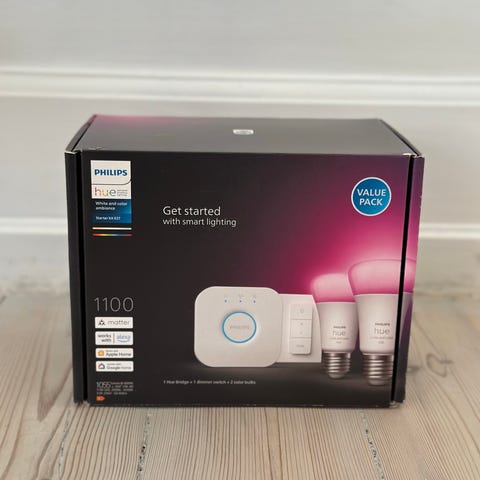 Philips Hue White startpakke med smart belysning. Sættet indeholder to E27 LED-pærer og en Hue Bridge til styring af lyset via app eller stemmestyring. Pærerne giver hvidt lys med justerbar lysstyrke. Systemet kan integreres med kompatible smart home-platforme og egner sig til brug i f.eks. stue, soveværelse eller kontor, hvor der ønskes fleksibel styring af belysningen.
