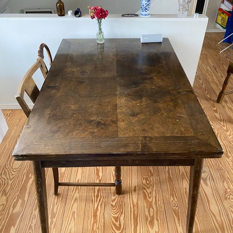 Bordpladen er slidt med brugsspor, men kan slibes hvis man ønsker det pænere.