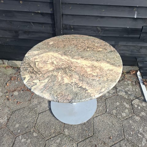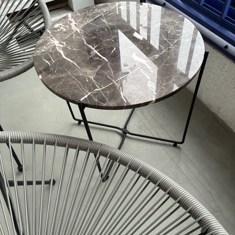 Ovalt sofabord med marmor bordplade og metalben. Bordpladen har lys grundfarve med årede mønstre i grønne og beige nuancer. Rustik Understellet består af buede massiv metalben med tværstiver, som giver stabilitet. Velegnet som sofabord eller sidebord i stue eller opholdsrum udendørs.