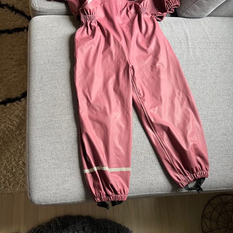 Regnsæt af mærket Steenholt i str. 98 og farven er sort. På regnbukserne er der justerbare stropper, så der kan være plads til de længere ben.