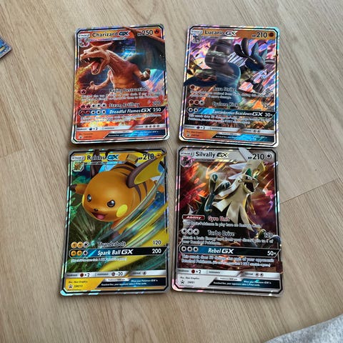 Pokémon Charizard GX samlekort. Forsiden viser Charizard GX med angrebene Wing Attack, Crimson Storm og Raging Out GX. Kortet er et Pokémon GX-kort med 250 HP. Bagsiden er standard Pokémon-kortbagside med Poké Ball-motiv. Velegnet til Pokémon-samling og spil.