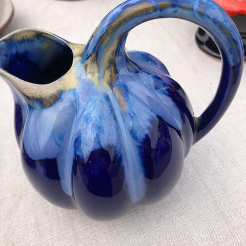 Keramik kande med hank og fod. Kanden har en lys grundfarve med dekorativt, håndmalet mønster i sort, gul og blå nuancer. Formen er svagt bølget foroven og kanden står på en rund fod. Velegnet som kande til servering eller som dekorativ genstand i indretningen.