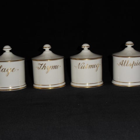 De 4 krukker er mrk. Thyme, Nutmeg, Allspice og Sage.