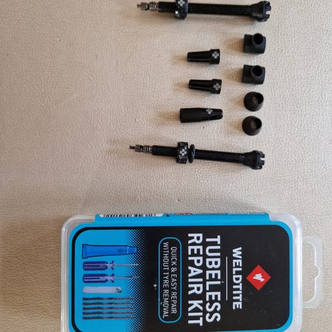 Tubeless reparations-sæt fra WTB. Består af værktøj til indføring af plugs, "ankre" der kan genbruges samt opbevaring af plugs.