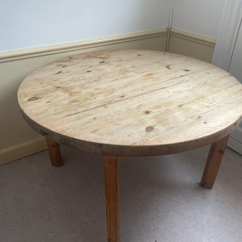 Rundt bord i malet træ hårdt træ. Ferskenfarvet. 80cm i diameter. Skilt ad.