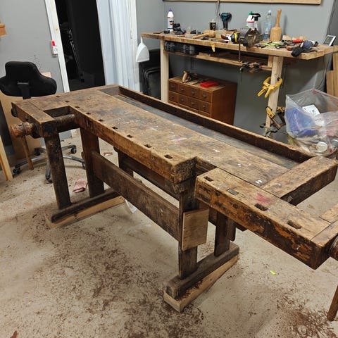 Høvlebænk i træ med massiv bordplade og integreret skruestik i den ene ende. Bordet står på kraftige træben og har flere huller i bordpladen til fastspænding af emner. Egnet som arbejdsbord eller høvlbænk i værksted eller garage. Mål - se billeder