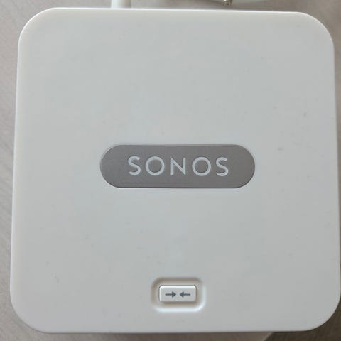 Sonos trådløs lyd-bro i hvid. Enheden bruges som forbindelsesled i et Sonos-system til at skabe stabil netværksforbindelse mellem Sonos-højttalere og hjemmenetværket. Leveres med strømforsyning som på billedet. Velegnet til brug i eksisterende Sonos-opsætninger, hvor der ønskes kablet netværk til Sonos-systemet.