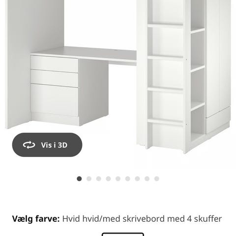 IKEA højseng til børn med stige i siden. Sengen er udført i hvidt stel med grå tekstil-sengehest rundt om liggefladen. Der er fri plads under sengen, som kan bruges til fx skrivebord eller opbevaring. Egnet til børneværelse, hvor man ønsker at udnytte højden i rummet. Mål fremgår af tegningen på billederne (højde, bredde og længde).
