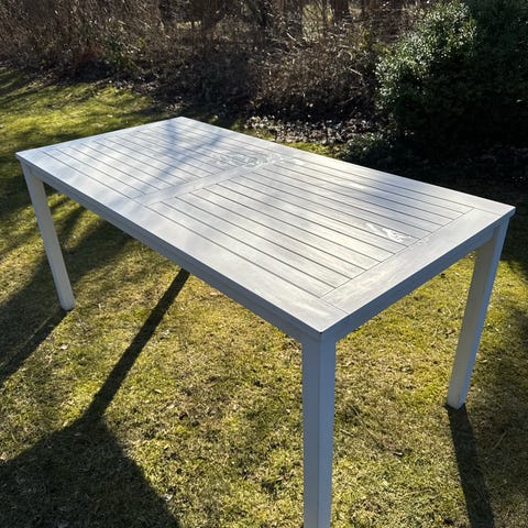 Rektangulært havebord i sort farve. Bordet har lamelbordplade og fire ben. Velegnet til udendørs brug i have, på terrasse eller altan som spisebord eller arbejdsbord. Kan bruges sammen med forskellige typer havestole afhængigt af behov og plads.