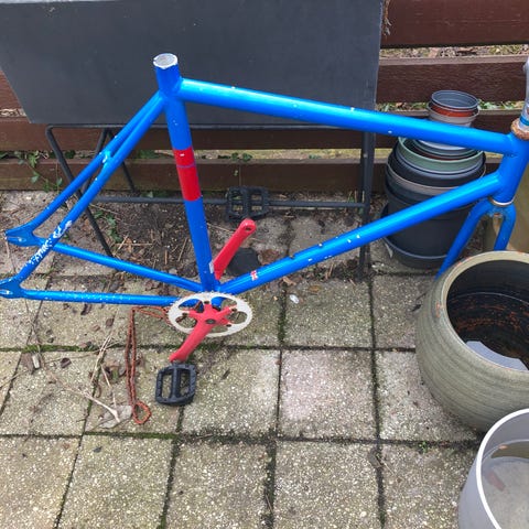 Cykelstel - selve stellet er i meget fin stand. Men som ses skal der nogle timer og noget arbejde til, før den er køreklar.