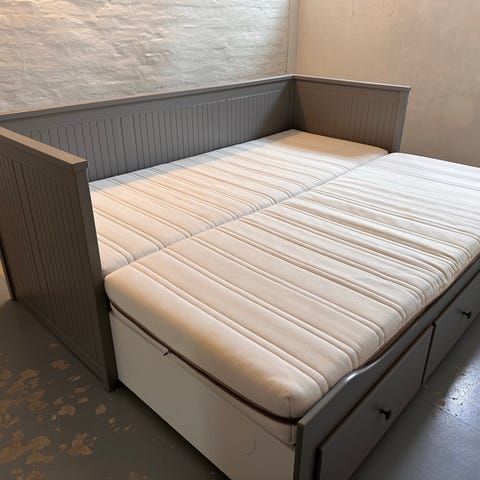 IKEA HEMNES seng med skuffer i hvid. Kan trækkes ud tii dobbelt soveplads. Fra røgfrit hjem. Sælges uden madrasser. Fejler intet, men med brugsspor.