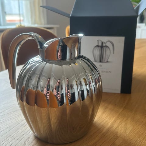 Georg Jensen termokande, Bernadotte, i rustfrit stål med rillede detaljer og håndtag.