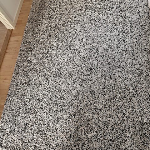 IKEA tæppe i flerfarvet design med brede felter i hvid og grønne nuancer. Tæppet har en blød, langluvet overflade. Egnet til brug i stue, soveværelse eller andre opholdsrum på trægulv eller lignende underlag.