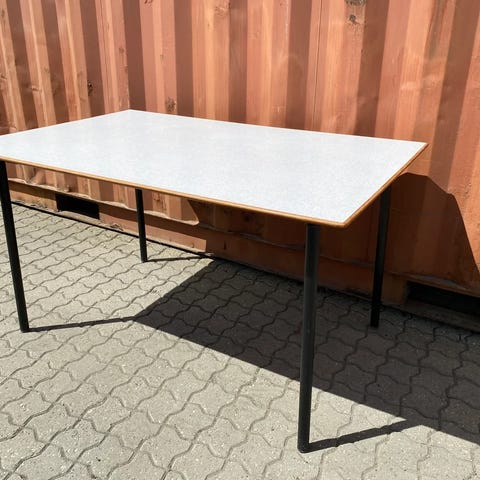 Formica bord fra 50’erne med teak træ kant og stålben. Med brugsspor.