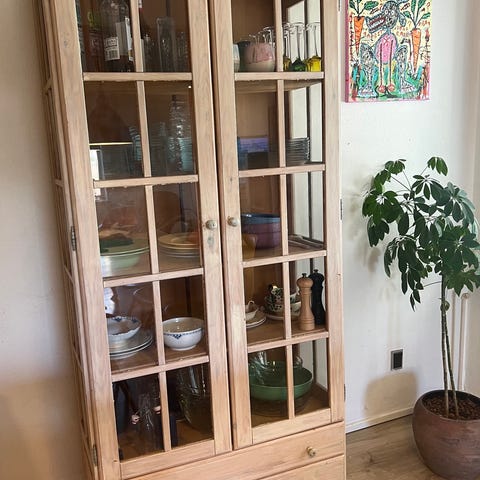 Højt smalt skab med glaslåge - velegnet til display af mindre figurer, CD'er eller lignende. Højde uden støttebenet i bunden er 162 cm. Siderne er grå ligesom indvendig i skabet. Glashylderne er ikke afbilledet, men er intakte og uden større brugsspor.