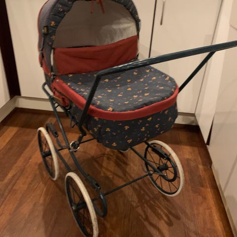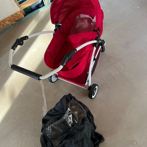 BRIO dukkevogn i rød farve. Vognen har metalstel med fire hjul og justerbart håndtag. Overdelen har kaleche og tilhørende lift/overdækning med mønstret foer indvendigt. Under stellet er der opbevaringskurv til tilbehør. Egnet til leg med dukker og bamser indendørs og udendørs.