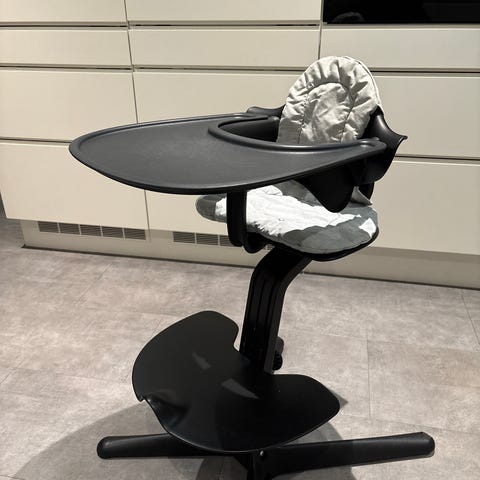 Stokke Nomi højstol i lysegrå plast. Ret pæn stand. Der følger bøjle og plade med. Pladen har nogle ridser. Kan afhentes i Kalundborg.