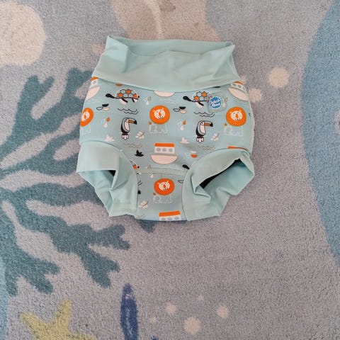 Splash About badeble i virkelig som ny stand. Størrelse 98. Design med havdyrmønster i blå, turkis, rød og hvid med kontrastfarvet turkis talje.