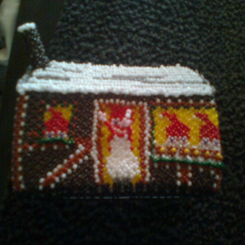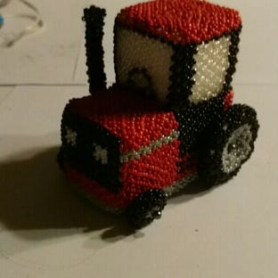 Det hele er syet i grønlanske perler og der er kun lavet den ene intet mønster det hele er hjemmelavet fra bunden af også bilen. Bilen måler i længden 18 cm og bredde 8 og 10,5 i højden. Traileren måler 18cm i længden og 10 cm i bredden og 7,5 i højden hele vogntoget måler sat sammen 35 cm i længden.