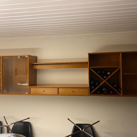 Modulopbygget reolsystem bestående af væghængt overskab med glaslåger og underskab til gulv. Systemet er udført i mørkegrå overflade med åbne rum, låger og skuffer i enkelte moduler. Egnet til opbevaring af glas, service, bøger eller dekoration i stue eller spisestue. Underskabet kan anvendes som skænk eller tv-møbel, mens overskabet giver ekstra opbevaringsplads uden at optage gulvareal.