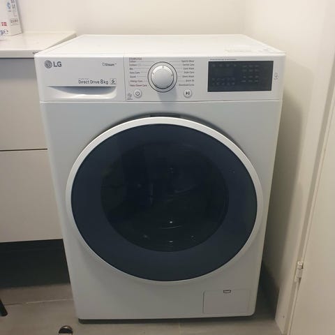 LG frontbetjent vaskemaskine i hvid. Kapacitet på 8 kg, velegnet til almindeligt husholdningsbrug. Maskinen har frontbetjening med drejeknap og display til valg af programmer og indstillinger. Egnet til installation i bryggers, badeværelse eller køkken, hvor der er adgang til vandtilslutning og afløb.