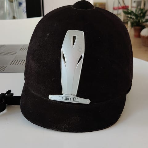 Ridehjelm til børn ca 8-10 år. Hjelmen har justerbar rem under hagen og drejespænde i nakken til tilpasning af pasform. Ydersiden er i sort materiale med mat overflade og ventilationsdetaljer. Indersiden har polstring for komfort. CE-mærket ifølge mærkningen på indersiden. Velegnet som beskyttelseshjelm til ridning.