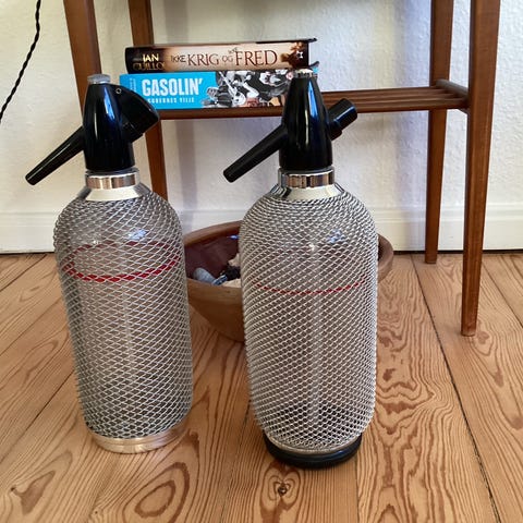 Blå flasker: sifon, paten m.mm