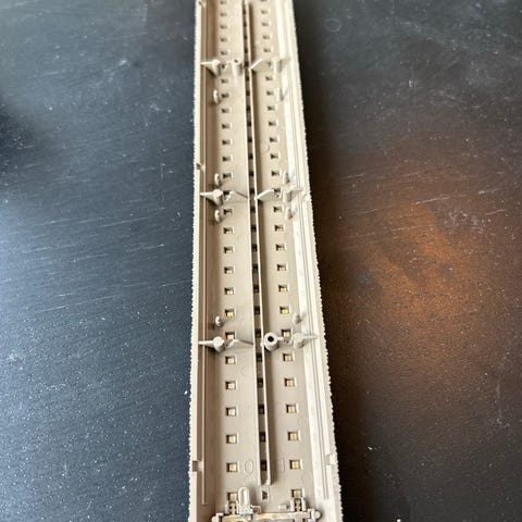 Märklin Trix C-skinne elektrisk sporskifte til modeltogbane. Sporskiftet er monteret på grå ballast-skinne og har indbygget elektrisk drev, som ses på undersiden. Egnet til Märklin C-skinne system og kan anvendes i modeljernbaneanlæg til skift mellem to spor. Farve grå med metal-skinner.