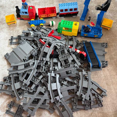 LEGO DUPLO 10507 togsæt med skinner. Sættet indeholder et tog med lokomotiv og passagervogn, skinnespor i rundbane, en lille station med ur, figurer samt tilbehør som dyr og kufferter. Egnet til mindre børn med store DUPLO-klodser, der er lette at håndtere.