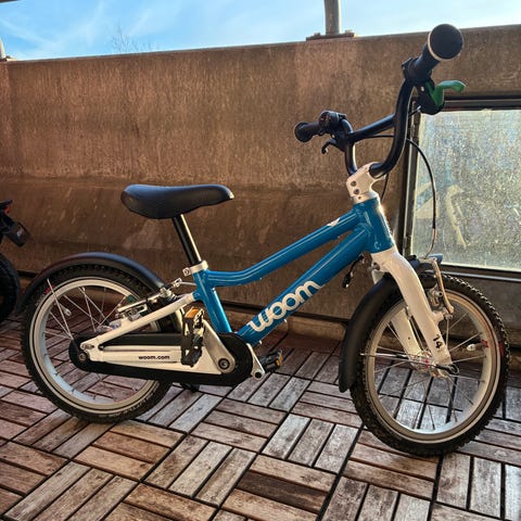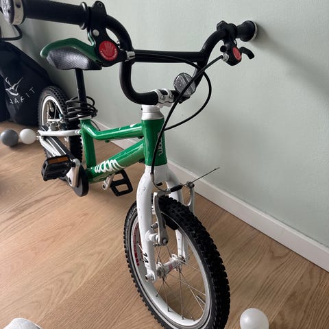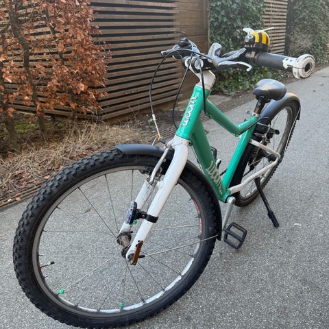 Woom 4 børnecykel med 20" hjul. Cyklen har et meget let stel i aluminium som gør det meget nemt for et barn at starte og komme i gang. Den har 2 håndbremser og tilbageløb på pedalerne. Det gør det nemt at placerer pedalen rigtigt når der startes. Den har 8 gear og støtteben.