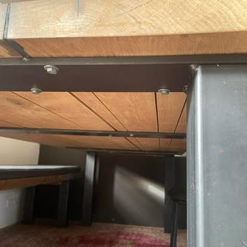 Spisebord med bordplade i egetræsfiner og bordben i massiv eg. Har nogle brugsspor på bordpladen som vist på billederne, men kan formentlig slibes af. Ellers i meget fin stand.