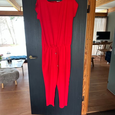 Mads Nørgaards klassiske buksedragt i sort. Buksedragten er i størrelse 38 og fremstillet i 100 % polyester. Modellen har korte ærmer og lange ben samt snøre i taljen, som kan justeres efter behov. Velegnet som enkel hverdagsbuksedragt eller til mere formelle anledninger afhængigt af styling. Prisen er pr stk.