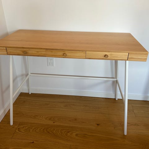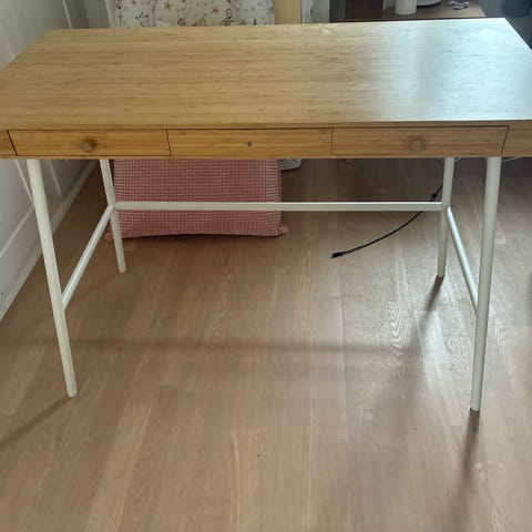 Smukt bambus skrivebord med hvide ben, enkelt og let design, nypris 1700