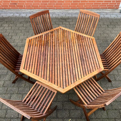 Et mega flot og stort trip trap havebord i rigtig god kvalitet med nye stole til. Bordet er 2.8 m langt med 2 plader i og 1.8 m uden plader i og 1 m bredt og 71 cm højt. Der medfølger hynder med til stolene. Sælges som sæt til 9200 kr eller bordet til 6500 kr og stolene til 3900 kr . Stolene sælges ikke stk.vis. Det har aldrig stået uden om vinteren.