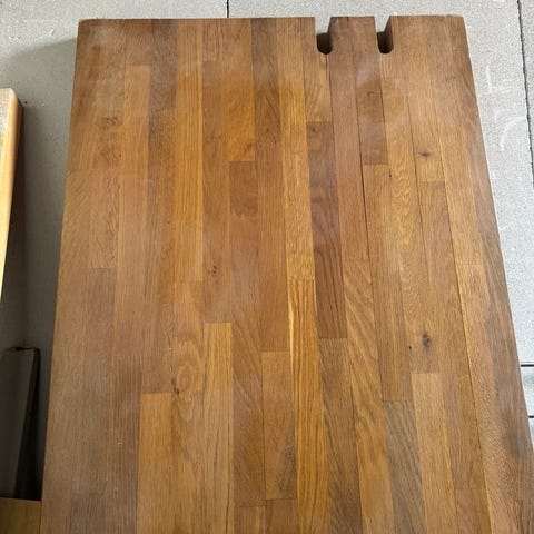 Har været brugt i værksted, så der er brugsspor og pletter på overfladen. Med en let slibning kan den dog nemt blive rigtig pæn igen. Perfekt til værksted, hobbyrum, garage, kontorbord eller som projektbord.