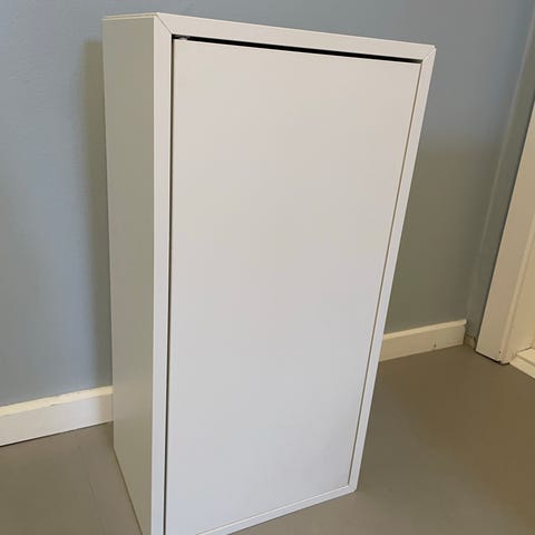 Vi giver dette skab fra ikea væk. Der er lidt hvid maling på den ene låge og lågerne binder lidt, når de åbnes og lukkes. Skal hentes i Allerød. Se mål mv her: https://www.ikea.com/dk/da/p/eket-skabskombination-med-ben-morkegra-trae-s39388000/#content