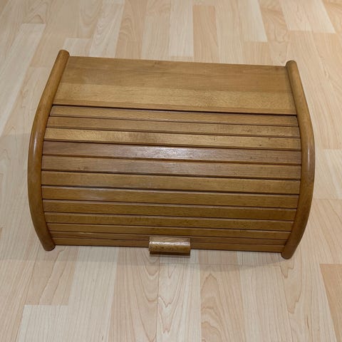 Brødkasse teaktræ med jalousilåg. Se mål på billeder.