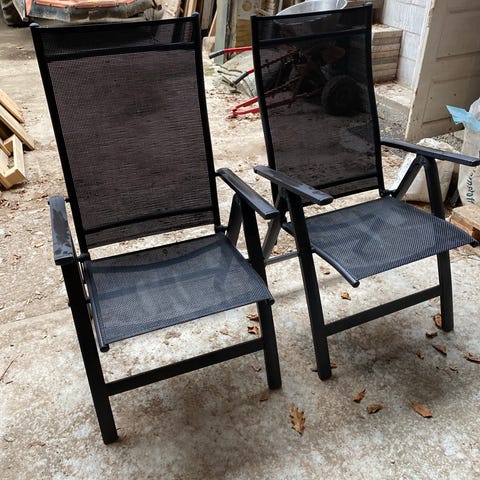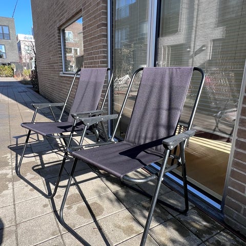 Haveklapstole med hynder i grå farve. Stålramme med armlæn og justerbar ryg, der kan lænes tilbage. Stolene kan bruges med eller uden de medfølgende polstrede hynder. Egnede til altan, terrasse eller have som udendørs siddepladser.