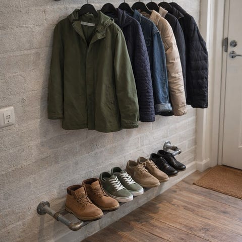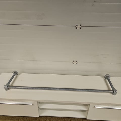 Bøjlestang med hylde, sort vandrør, mørk bejdset træhylde