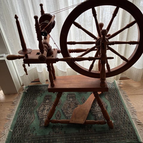 spinderok i brunlakeret træ. Traditionel fodbetjent spinderok med stort hjul, træpedal og drejet træstel. Velegnet til spinding af garn i hjemmet eller som dekorativt møbel i boligindretning. Konstruktionen omfatter rokkehoved med spole og snoretræk samt stabil fod med skrå ben for støtte under brug.