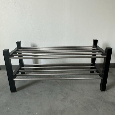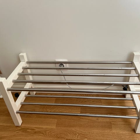 IKEA TJUSIG skoreol med to hylder. Stel i hvidt træ og hylder med metalstænger. Ca. mål: længde 79 cm, dybde 37 cm og højde 32 cm. Velegnet til opbevaring af sko i entré, gang eller garderobe. Kan placeres fritstående på gulv op ad væg.