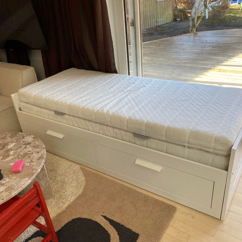 Sælger denne super funktionelle IKEA BRIMNES seng, da vi skal have plads til noget nyt. Det er den ideelle løsning til gæsteværelset, børneværelset eller den lille lejlighed, da den fungerer som både sofa, enkeltseng og dobbeltseng.