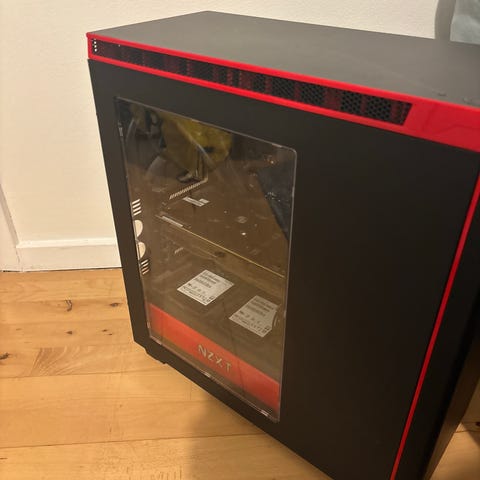 Asus stationær computer i Shark Gaming kabinet. Kabinettet er sort med sidevindue og grafik på siden. Indvendigt ses Asus-komponenter, herunder et Asus-grafikkort. Systemet er opsat med Asus bundkort, som på BIOS-skærmbilledet viser temperatur- og blæserstyring. Velegnet som stationær pc til generel brug og gaming afhængigt af den konkrete hardwarekonfiguration, som ikke fremgår nærmere af oplysningerne her.