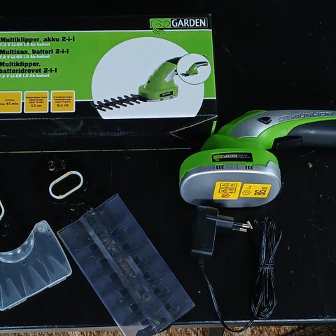 Batteridrevet multiklipper med 2 forskellige sværd, som kan skiftes. Egnet til mindre hække og buske. Leveres med original emballage, oplader og tilbehør, som vist på billede. Kun brugt et par gange.